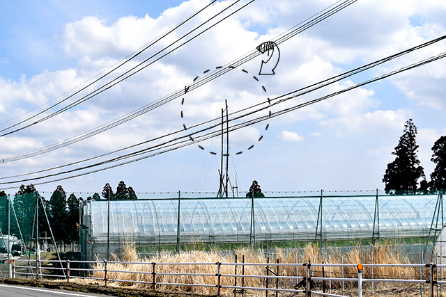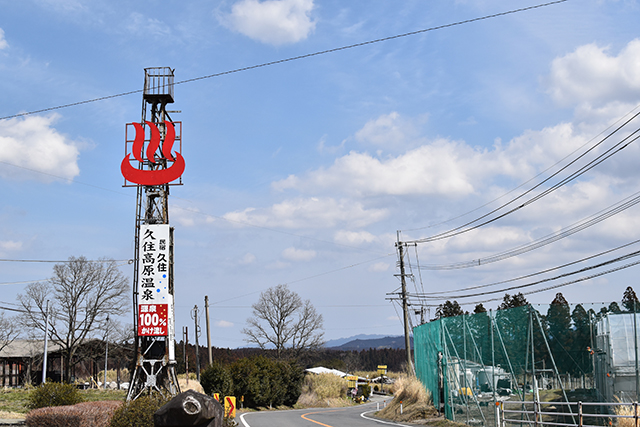 温泉マークの看板の道路を挟んだ斜め向かい。2本の柱が見えているトコロが目的地。