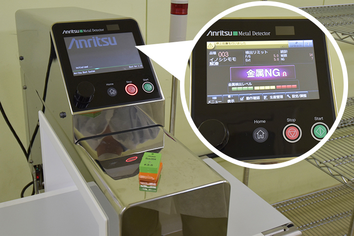 そして、こちらは仕入れた肉に銃弾などの金属片が混入していないかを検査する金属探知機。金属を検知した場合を再現していただきました。