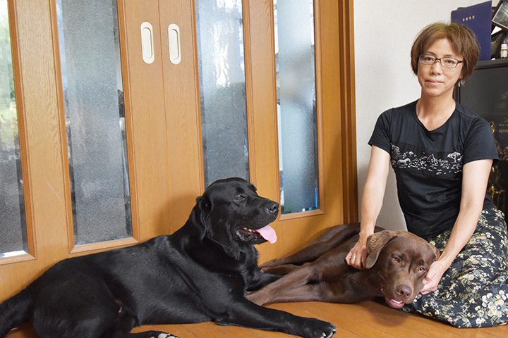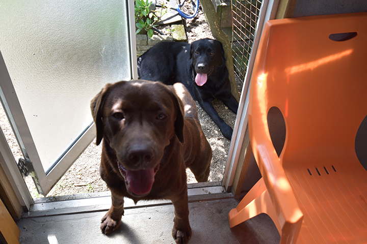広畑さんと一緒に鴨猟に行くレトリーバーのテラ(左:黒 3歳)とシエル(右:茶 9ヶ月)の大歓迎を受けつつ、お話を聞きました。