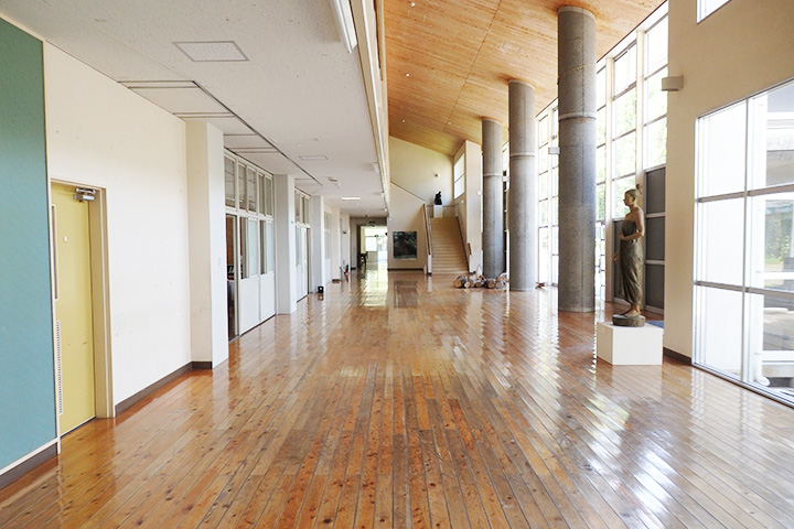 1Fの多目的ホールは木製の床や天井で温かみのある空間です。大きな窓からはさんさんと光が降り注ぎ、彫刻やオブジェを優しく照らしていました。