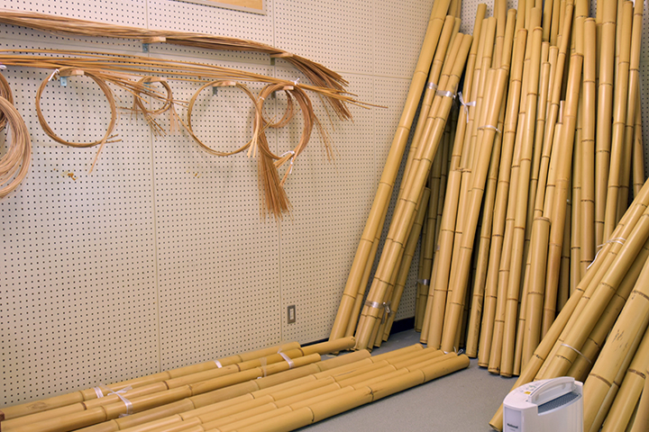 音楽室の中の準備室では、除湿機を使って素材になる竹を乾燥していました。主に使われるのは「真竹(まだけ)」という品種です。大分県はこの真竹の生産量が日本一。この豊富な竹材を使った竹工芸品の歴史的は古く、室町時代に行商用の籠を作って売り出したのが始まりと言われています。現在でも竹工芸品は大分のお土産品として人気です。