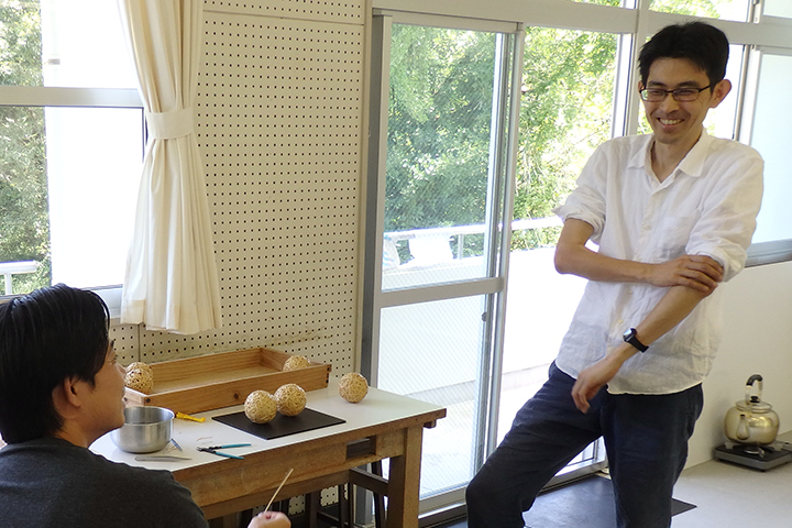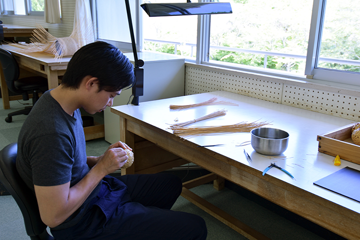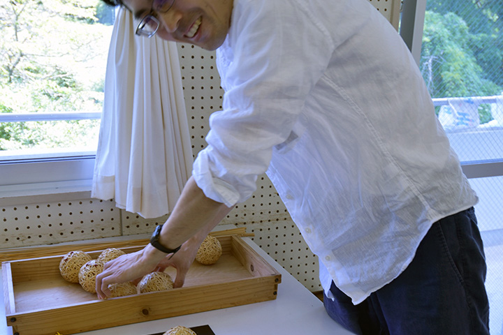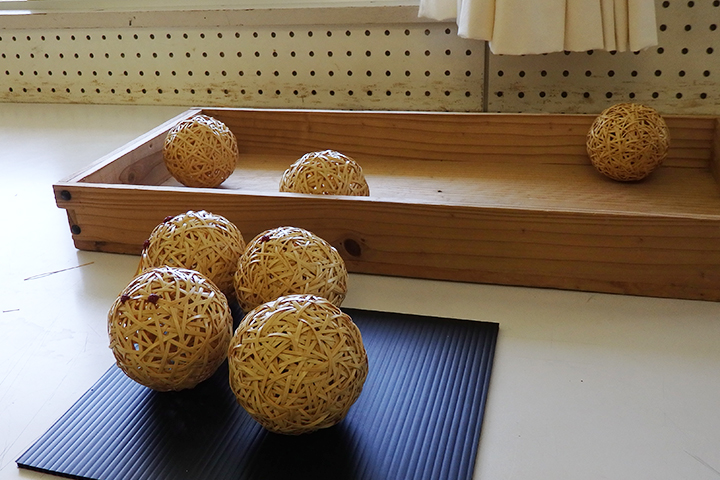 池さんは黙々と細いひごで丸いオブジェを作っています。