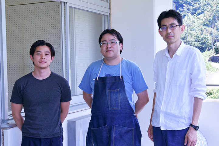 工房にいらっしゃったのは中臣 一さん(右)と、アシスタントの池 将也さん(左)上岡 髙行さん(中)。中臣さんは大阪府出身で4年前から竹田市に移住。池さんは福岡市出身、上岡さんは別府市出身で、現在は竹田市に移住しています。