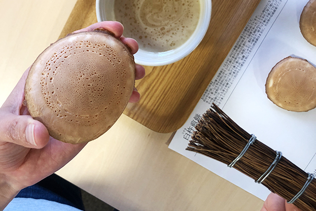 刷毛は短く切りそろえている方にタレをつけていきます。これで臼杵煎餅の特徴の縞模様をつけますよー!