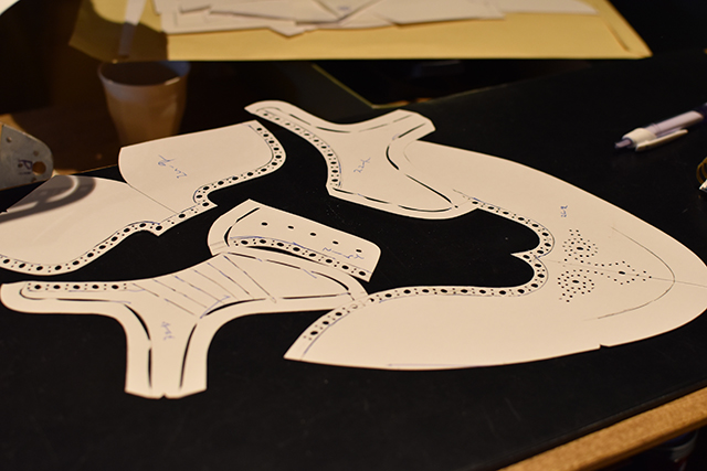 靴作りの工程は足の採寸をして木型を作り、お客様と決めたデザインに合わせて型紙を作ります。